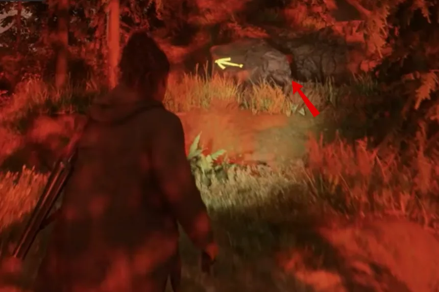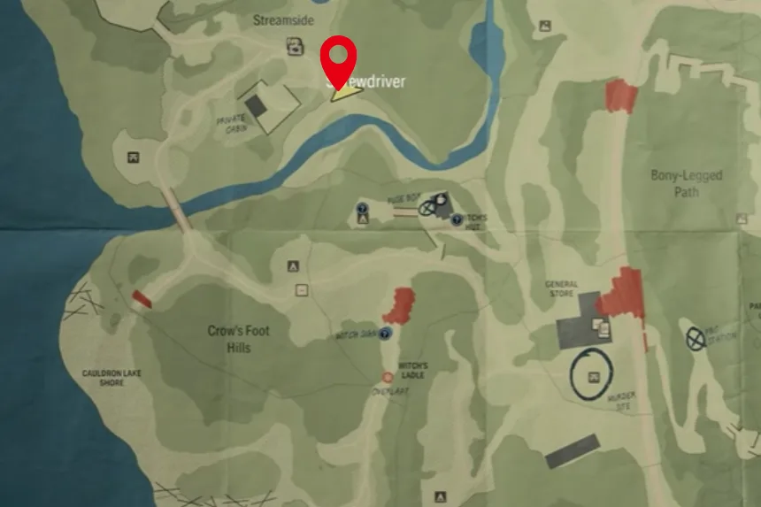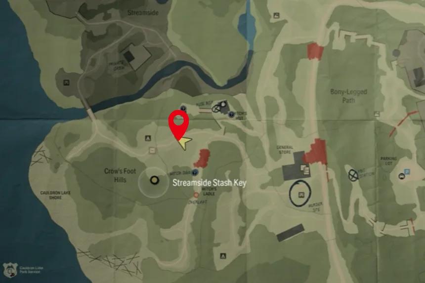 Puzzle Solution: Use your flashlight to spot a glowing number on a tree. Nearby, you will find a key on the ground that opens the stash. You will need a Screwdriver (found elsewhere in the game) to access certain locked cabins for this stash.