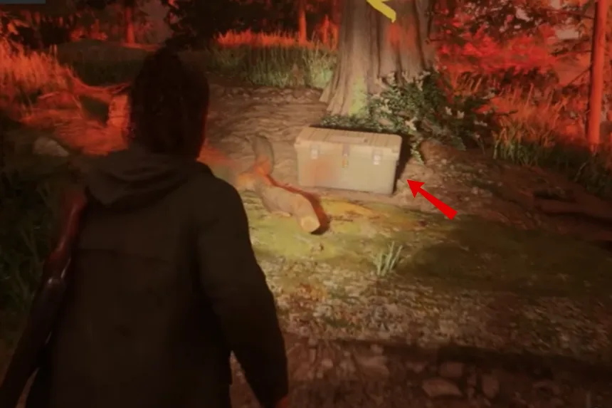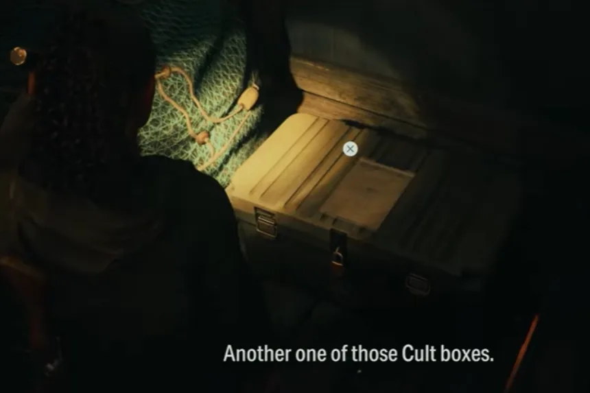 You will find this cult box on the same path as the previous cult box at the southwest edge of the woods near Kari’s Garage on the map. You will find this one right next to a Break Area cabin.