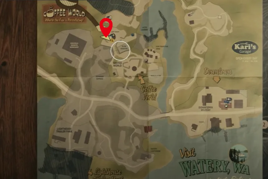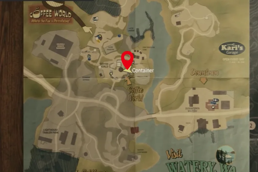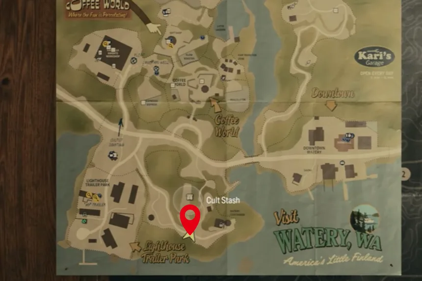 You will find this cult stash just north of Downtown Watery, at the southwest edge of the woods near Kari’s Garage on the map.