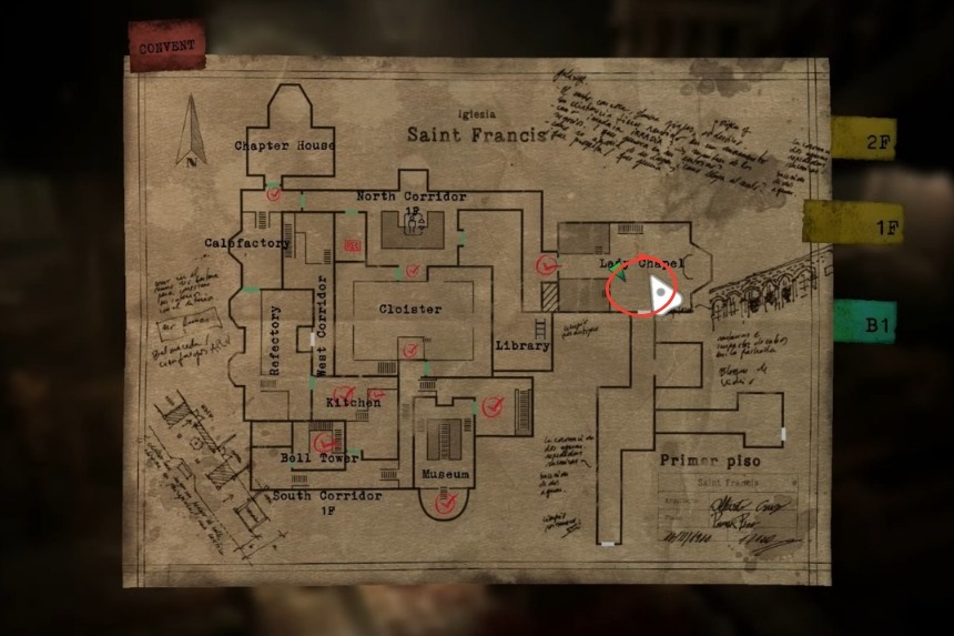 To acquire Mother Lucia’s Diary 2, start in the Convent. Go to the Prison Section’s crypts, and you’ll find a room there that’s filled with jugs; inside, you will find a table with the diary sitting on top of it.