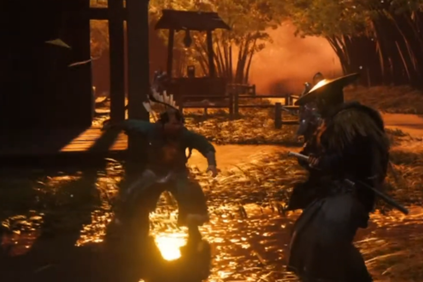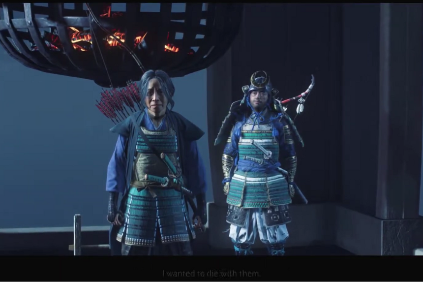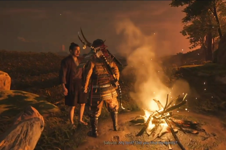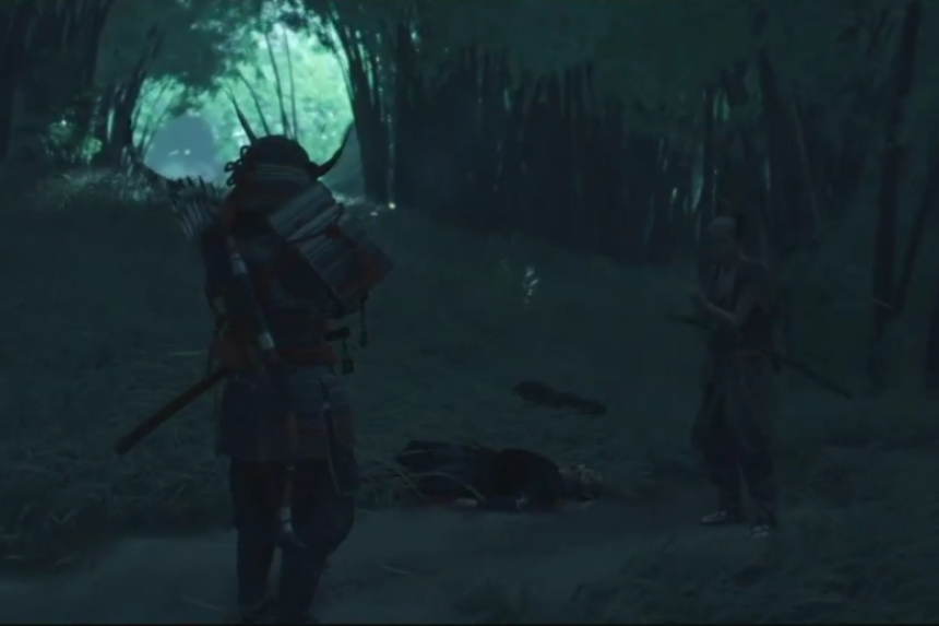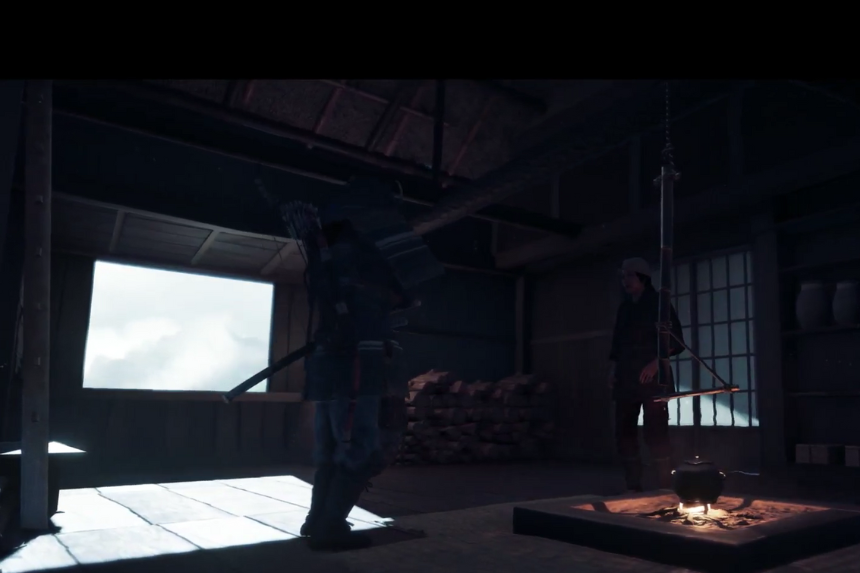 After the fight, you and Ishikawa will head to a small camp. Take a moment to look around the area. Here, the Sensei will give you flaming arrows.