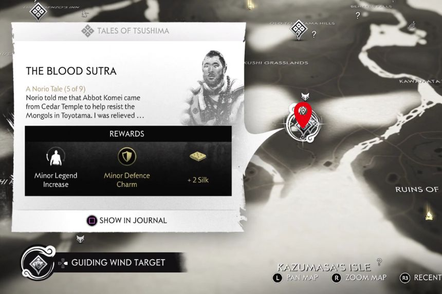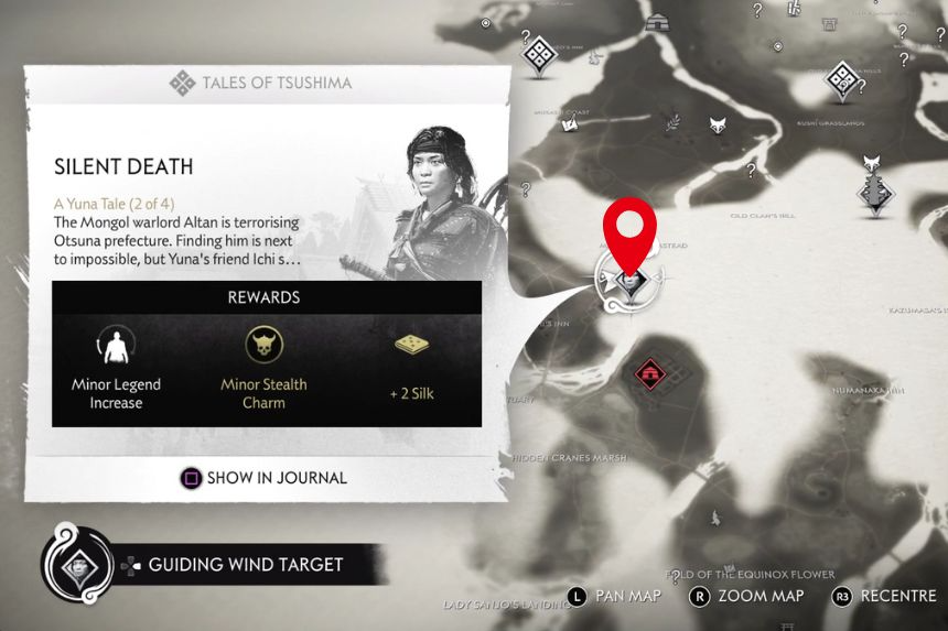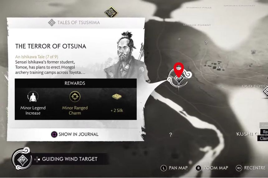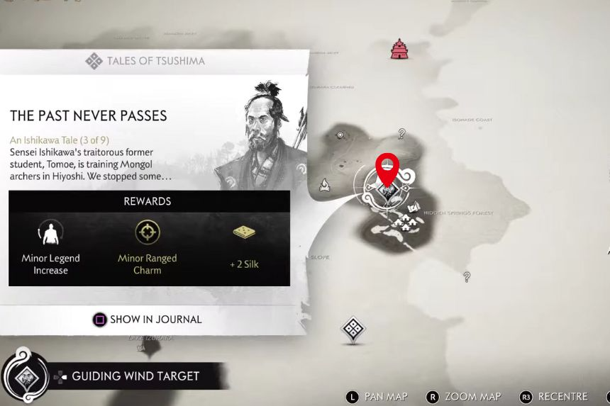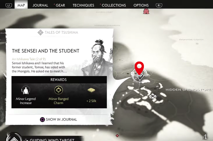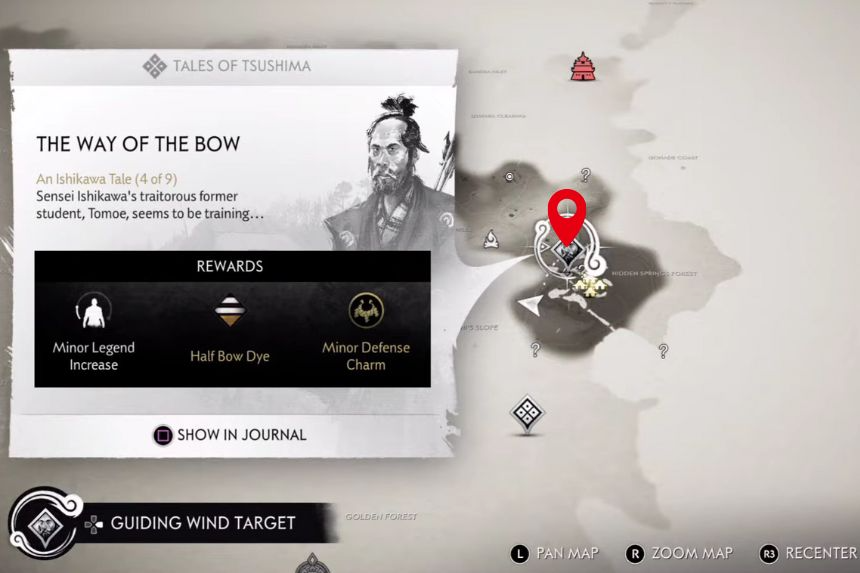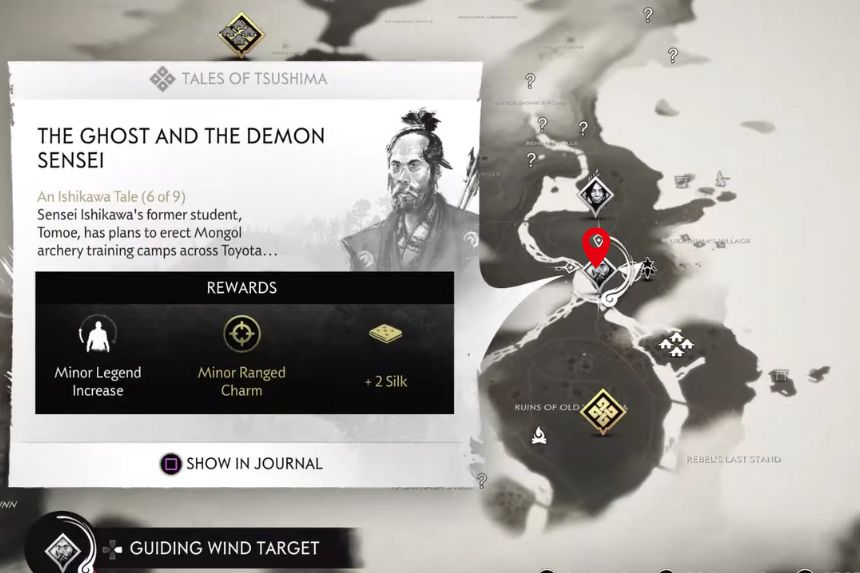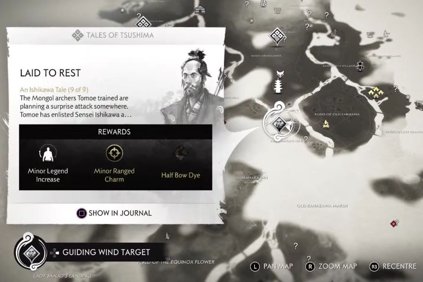 An Ishikawa Tale includes 9 side missions that follow Sensei Ishikawa and his guidance throughout Tsushima. You will progress by completing quests in sequence. Rewards for completing these missions include boosts to Legend, various charms (ranged, defense), Linen, Leather, Silk, and unique items such as the Mongol Commander’s Armor or bow dyes.