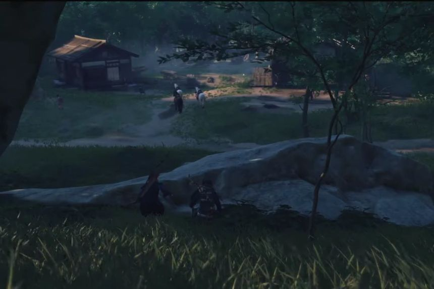 After talking to the monk, head to the village that was attacked by the Mongols. Your main task is to find Hochi. Go to the balcony of one of the houses to get a better view and locate your ally.