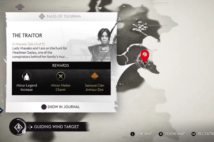 A Masako Tale consists of 9 side missions that follow Lady Masako on her personal journey of revenge and justice. You will accompany her through investigations, battles against Mongols and bandits, and rescue missions. Each mission rewards Jin with boosts to Legend, various charms (Prosperity, Melee, Stealth), Linen, Silk, dyes for armor, and unique items such as the Samurai Clan Armor dye or the Adachi Clan Half-mask.