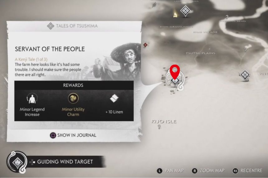 Next, head to the Kushi Grasslands near the temple. There, you will meet a monk who will accept the totem from you. This completes the mission. Completing this quest rewards you with a small increase in Legend, a Lesser Prosperity Charm, and +14 Linen.