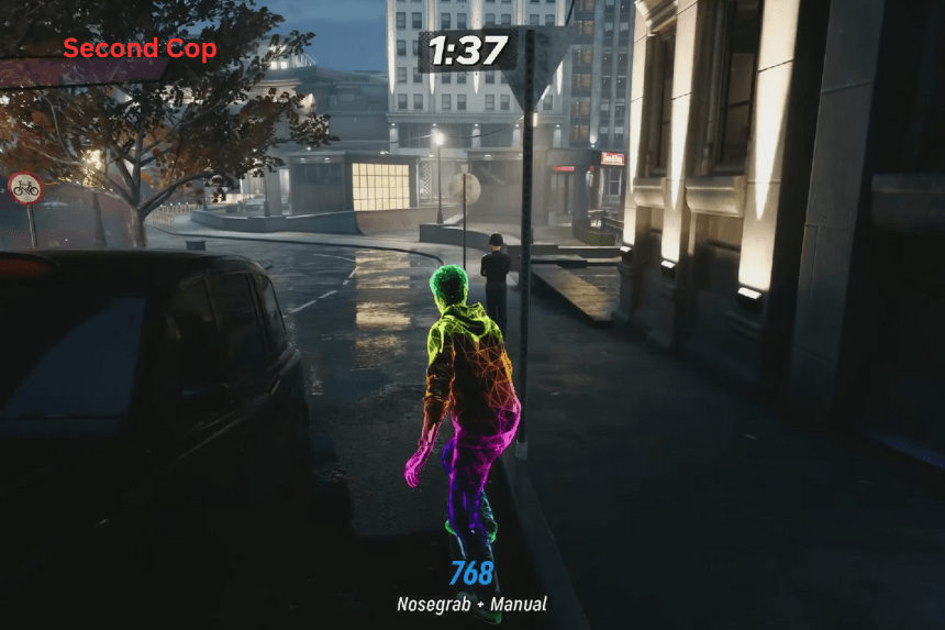 First Stat Point: You’ll spot this one above a streetlamp. To reach it, climb the nearby building, grind along the edge, and then jump toward the stat point to grab it.
