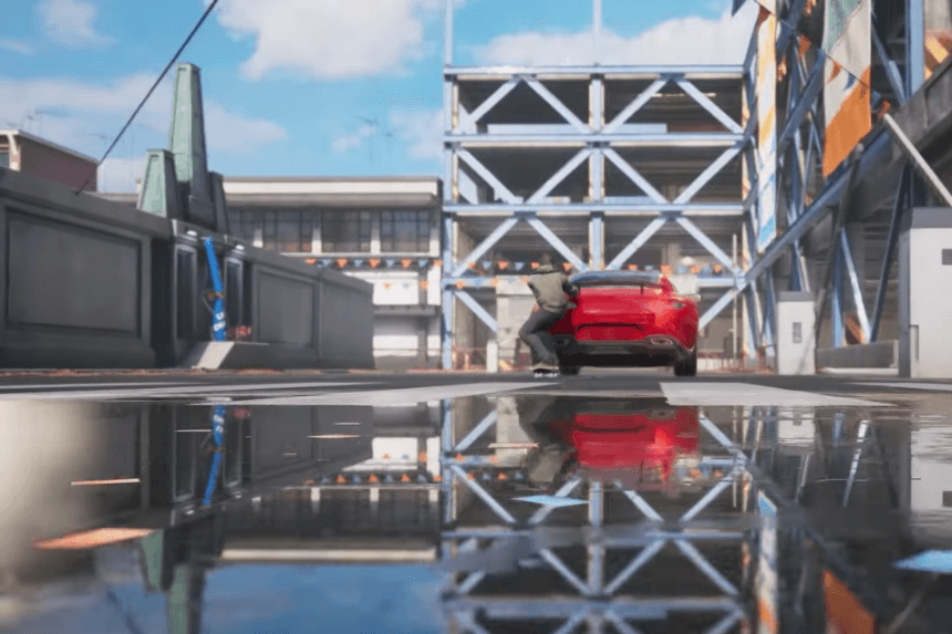 Head to the main square and look for the scaffolding near the fountain. To get inside, grind the wire that stretches across the fountain, and it’ll lead you right into the scaffolding where the logo is hidden.
