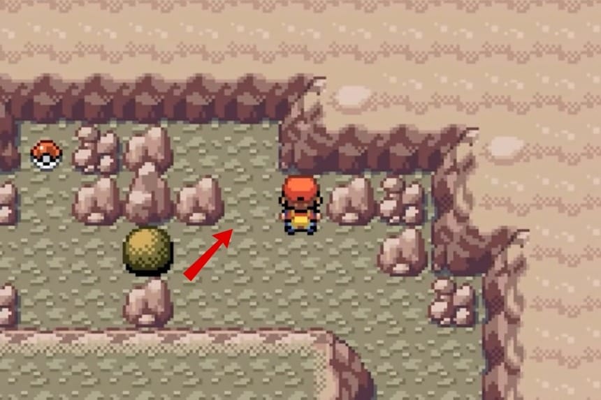 At the starting point, you’ll find two rocks on your left. You’ll need to use your strength to push those rocks one by one to clear the blocked path. Once the path is clear, go northwest, and you’ll find a yellow patch between the walls. This is where the Ultra Ball can be found.