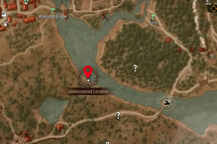 From Woesong Bridge, head north across the fields. Keep an eye on your map for a “Hidden Treasure” marker. When you get there, be ready, some wolves usually appear to attack.