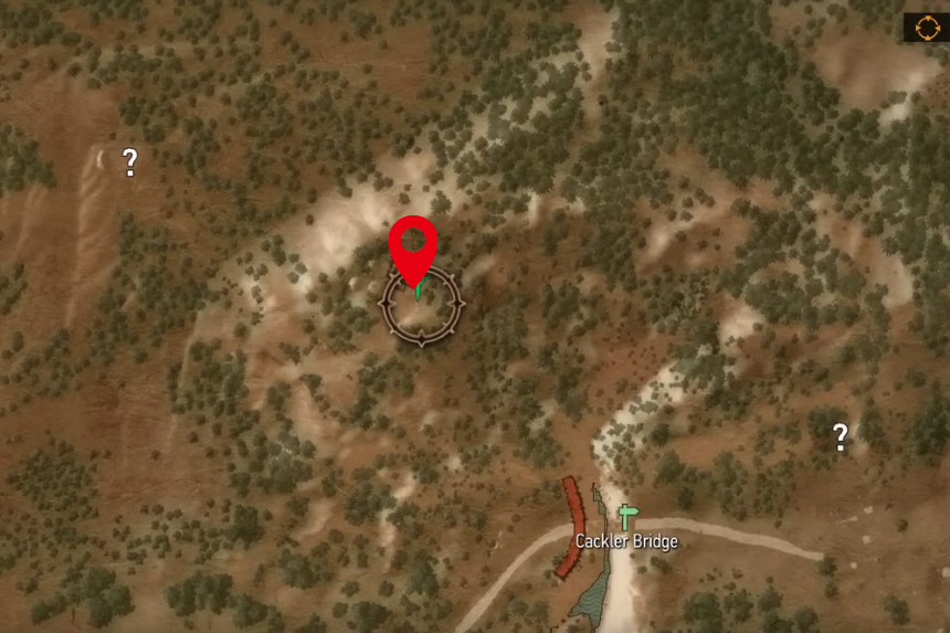 From the bandit camp, look to the west, and you will see another question-mark icon. Slide down the cliff, and you will find another hidden treasure near a dead man.