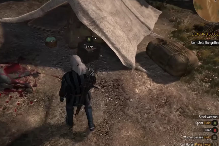 Back near the Nilfgaardian Outpost, go south again to find a bandit camp. After defeating the bandits and clearing the poison gas with Aard, check the ground for a small hidden treasure chest with gauntlets and coins.
