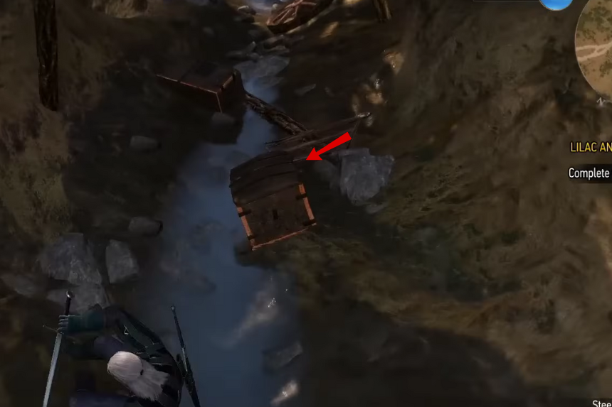 Head south along the coastline, and you will come across one hidden chest, with another one further down the river. When you reach the bridge, look on the ground, and you will find a dead merchant holding a Temerian lily key. Dive into the water below the bridge, and you will spot the cargo he tossed in. There’s a chest down there containing blood-soaked military orders, a silver amber necklace, and some insignia.