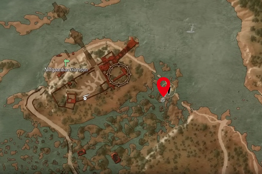 From the Nilfgaardian garrison, head east until you reach the water. Swim out into the middle of the lake, and you will spot a half-sunken boat. Dive underneath it, and you will find the rest of the wreck along with a body. Next to him is a small treasure container holding a brigade sword and ten florins.