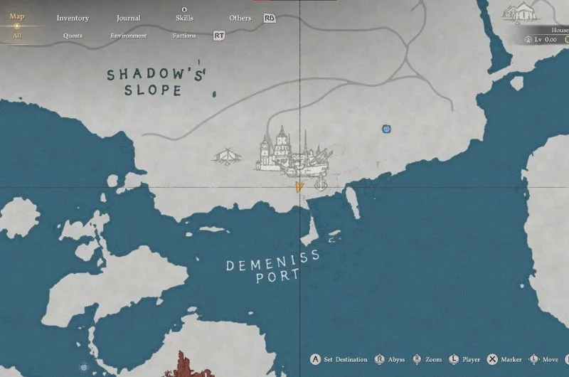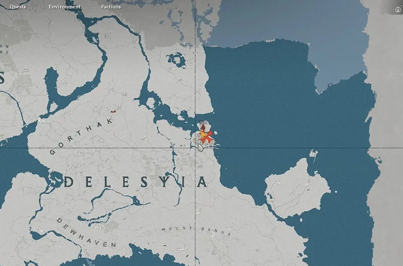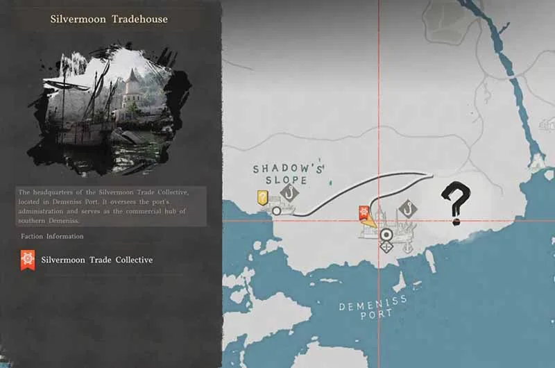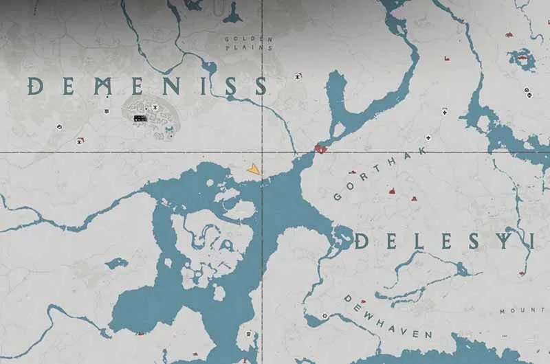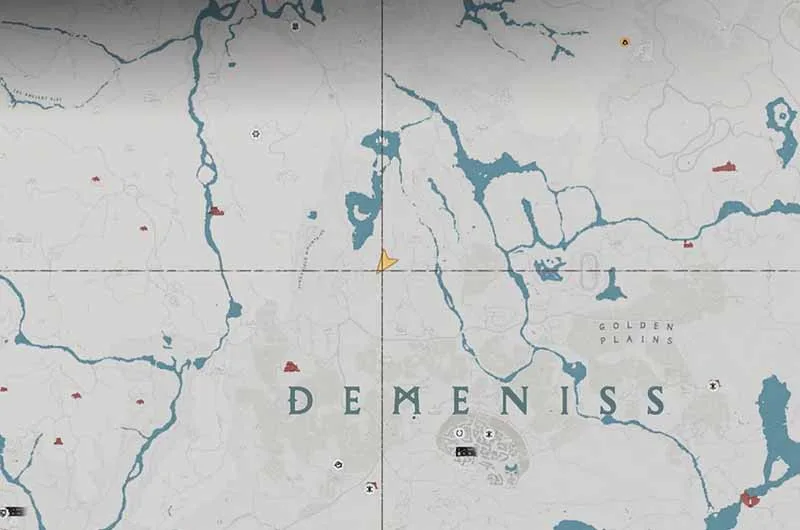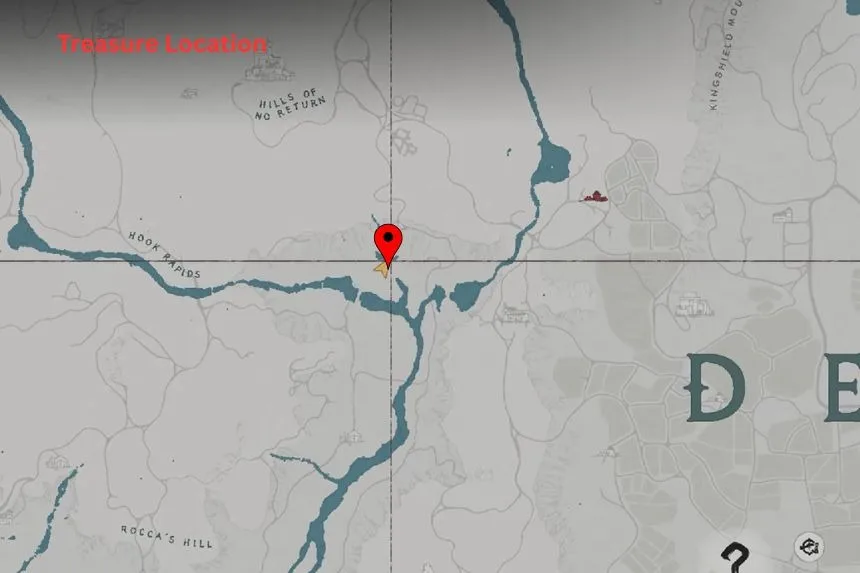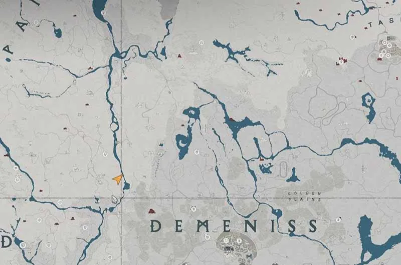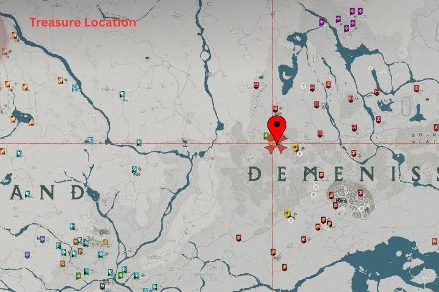 The hidden treasure map 1 is found on the north side of Demenis, south of Drakesfall Gorge, inside a white tent. The map will show a location near a waterfall.