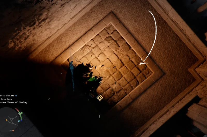 Once there, aim down and use the forced palm on the weird patter on the floor, this will flip the floor and you will fall inside the room with the treasure chest, claim the Blackwing Leather Boots armor piece.