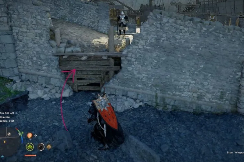 The treasure is found by going towards the area above Deminis. When you arrive there, look for a small wooden board or plank near the ground. You can slide underneath it or push through the gap behind it. The treasure is hidden behind the wooden fence.