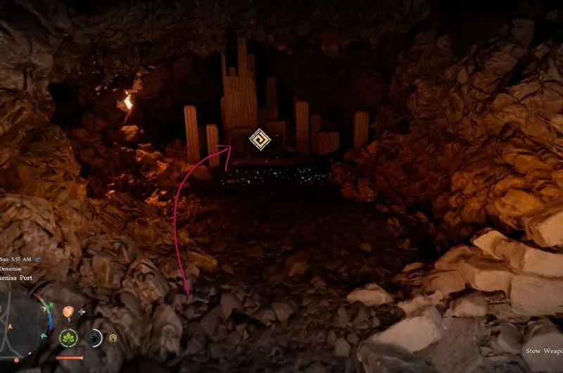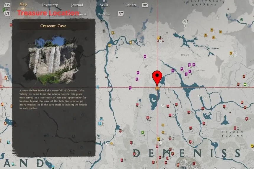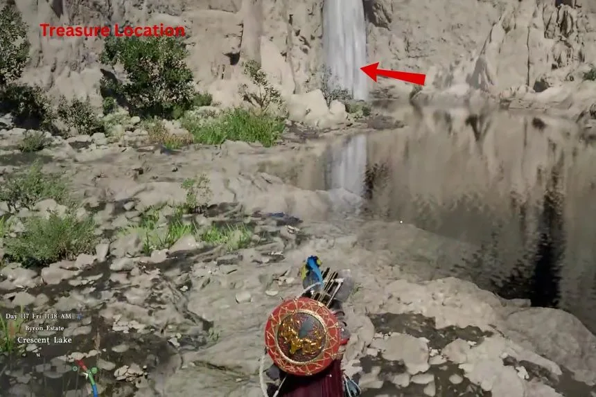 You can find the hidden treasure map 12 on top of a small shrine in the northern part of Deinis. After picking up the map, you need to reach the area near a waterfall.