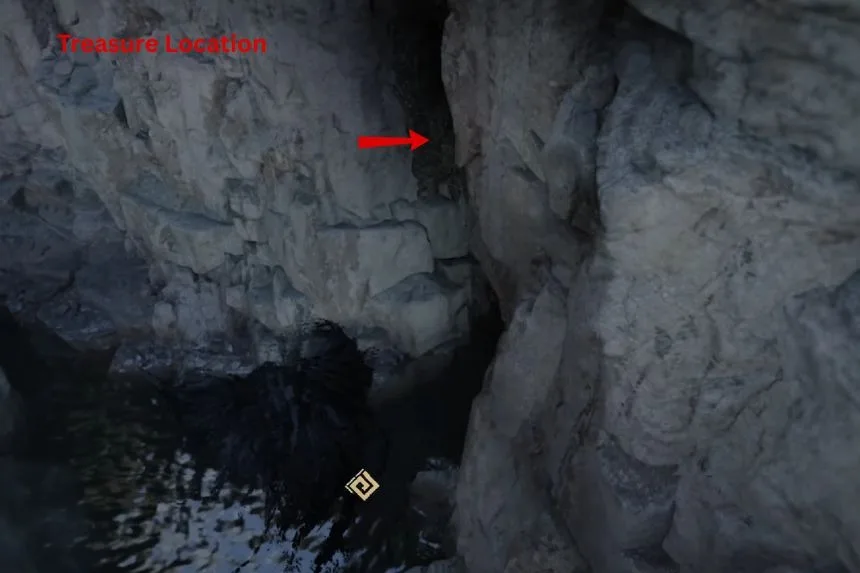 The map suggst the above location on the map and a hidden cave. Go to the lcoation, and jump down the cliff. You will notice a cave with the path blocked. Use forced palm and at the end of the cave, you will find the chest.