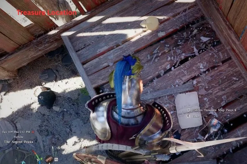 The hidden treasure map 4 is found inside a small hut located in the northern part of Paloon. The map is lying on the floor, and it shows a tower in the background.