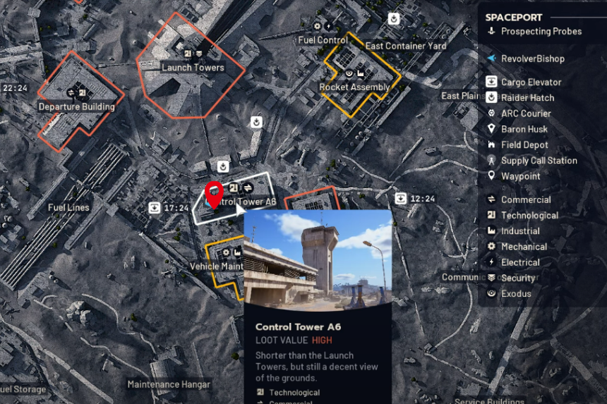 Once you’ve got the Spaceport Control Tower Key, head over to the Spaceport and use it to unlock the tower. This key lets you access the Ground Control Tower in the Spaceport. It’s a great spot to search for higher-tier equipment or mission clues. After you’ve got the key, make your way to Control Tower A6 and look for the entrance.