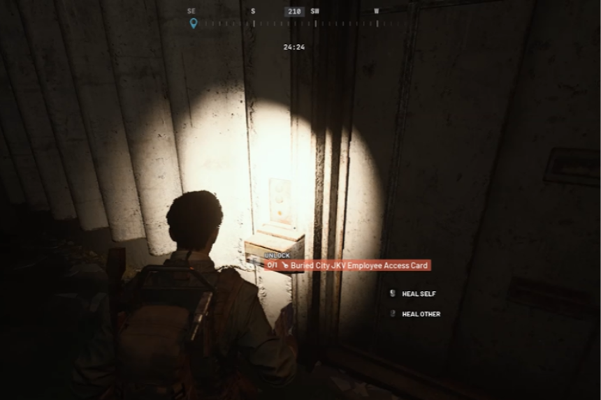 Once you’ve got the keycard, head to the Space Travel building located next to the Parking Garage in the middle of Buried City. Go inside and make your way up to the fourth floor using the stairs. When you reach the top, you’ll see a locked steel door with a keypad slot beside it. Use your Buried Employee JKV Access Card on the keypad to unlock the door, head inside, and collect all the loot waiting for you.