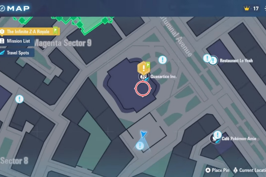 Another King’s Rock can be received through the quest for Side Mission 084. This side mission will open up on its own as you advance through the story. This side mission can be found in the northwest region of Lumiose City, in the Magenta sector in Sector 7, inside the fenced-off battle space that’s located in the Quasartico Inc. building.
