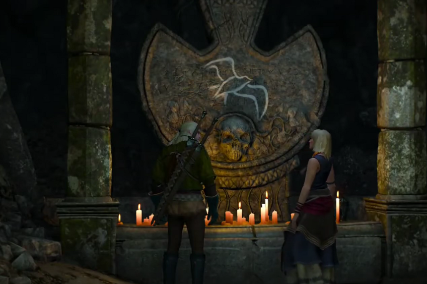 Once you solve the torch puzzle, Geralt and Keira can step into the room beyond, which looks like some kind of old sanctuary. Head up to the shrine, and a cutscene will start. Geralt and Keira talk about who might have built the place and what its current condition means. Keira then picks up the magic lamp, though she’s not entirely sure how it works.