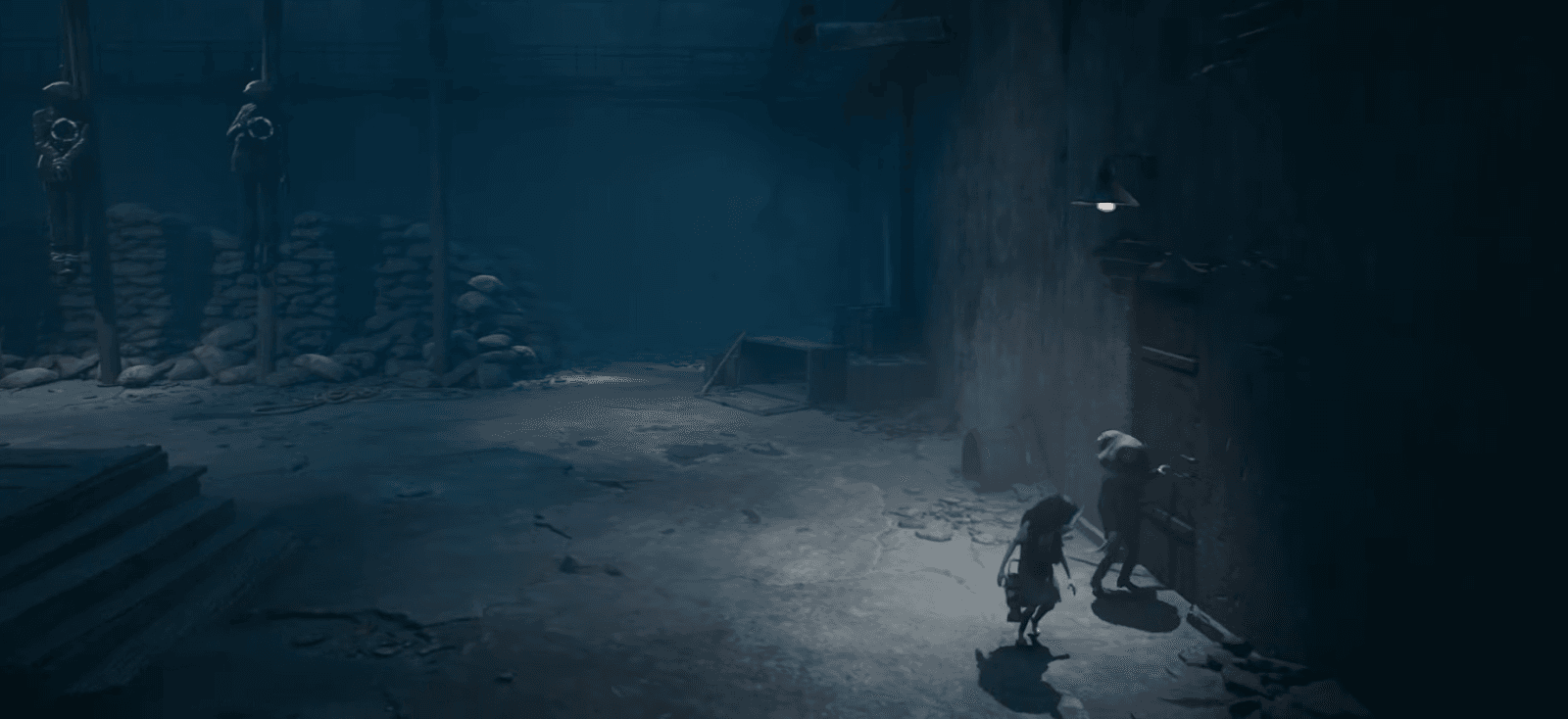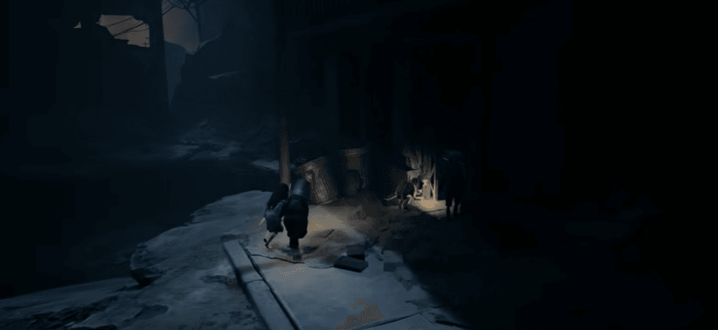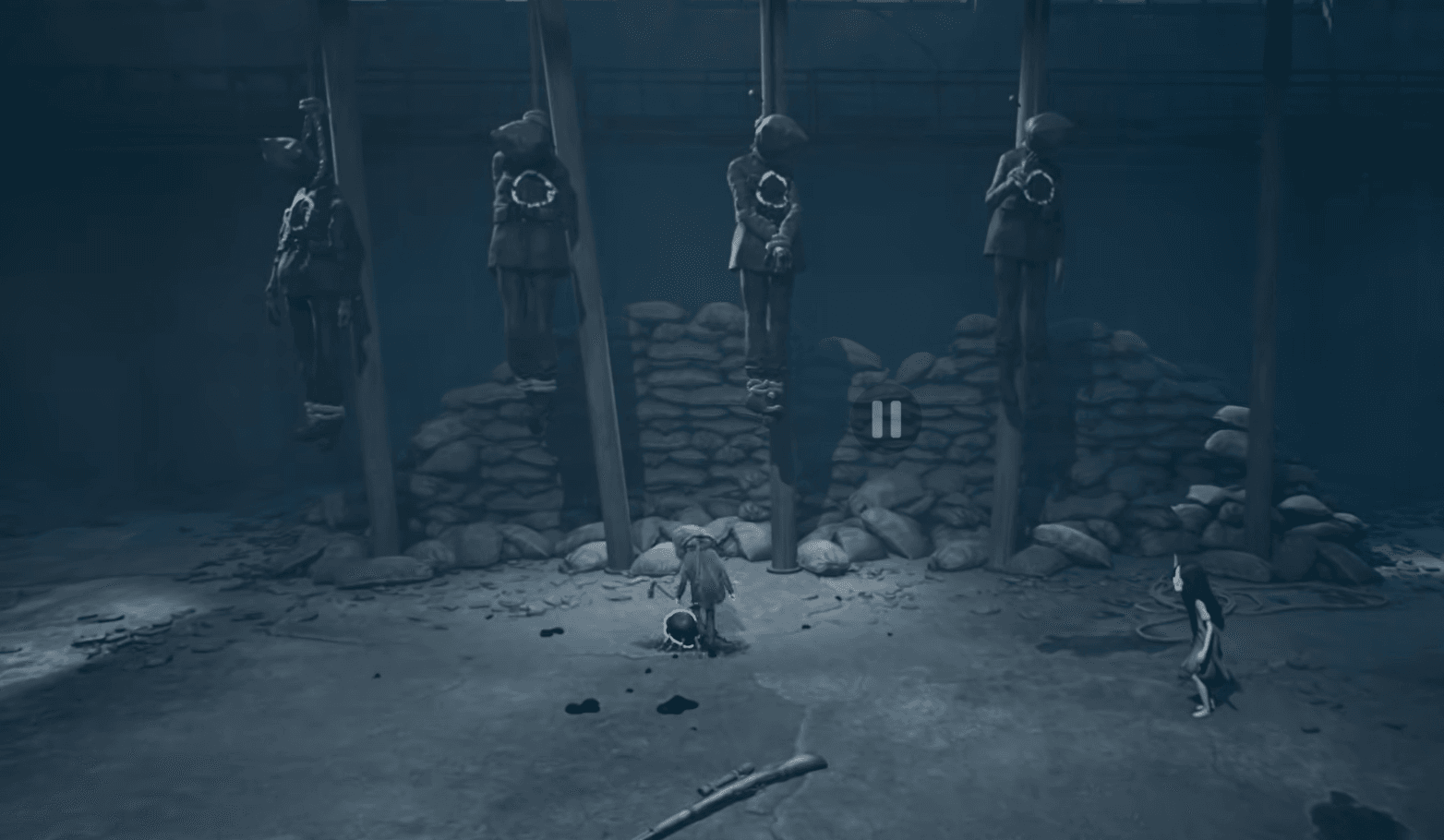 Shoot the hanging soldier to get the key, interact with the oven door in the next area to free a critter that carries the final mask, and kill it to get the Gas Mask.