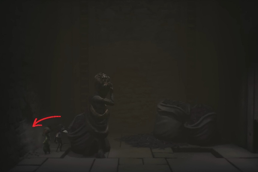 The first time you have to hide from the big baby, you’ll use a platform to reach a lower level. Instead of going right as the path normally directs, head left. You’ll encounter a wall that you can destroy—pass through it to enter a new room where Doll 2 is waiting. This one requires a little exploration, so don’t rush past it.