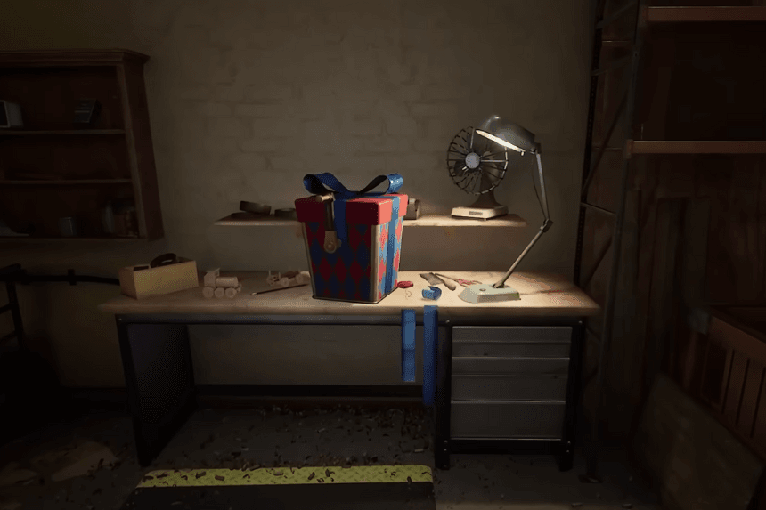 Follow the hallway leading to the Workshop and Warehouse doors. Turn right and open the Creator door to find the present.