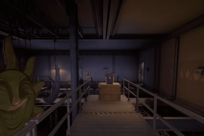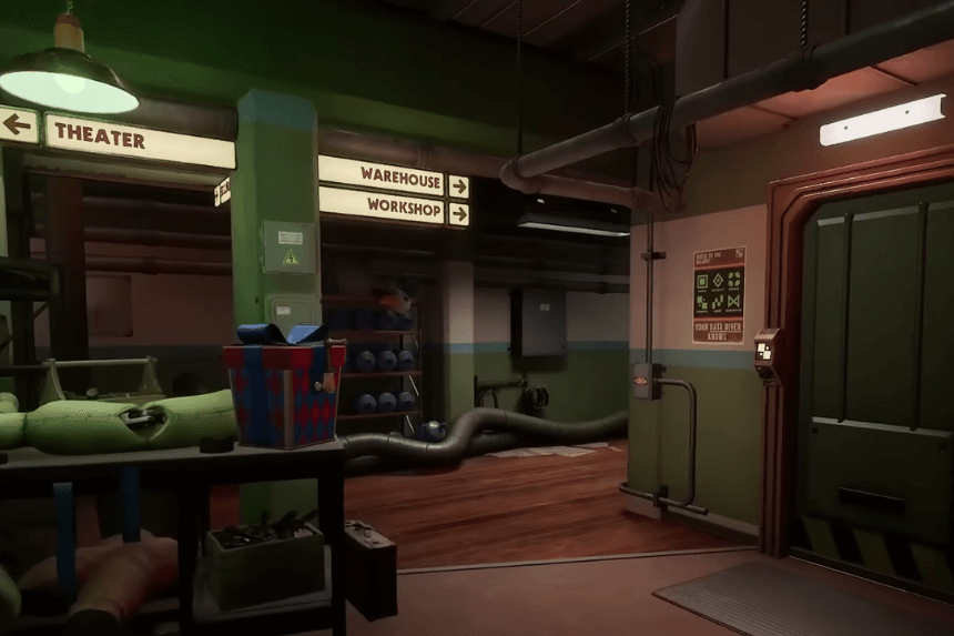 Same Theater area past the locked door, go to the end of the hall and down the stairs. Enter the Workshop, walk straight, then turn into another Theater door. Crouch under the debris, go up the steps, and you’ll find the hammer held by a costume.