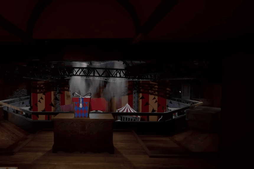 Upstairs in the Big Top Showroom. Go through the prize wheel cubby, then into the locked room on the balcony’s right side.