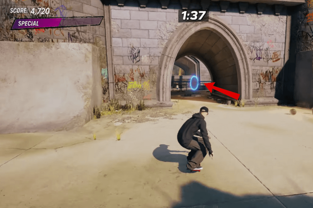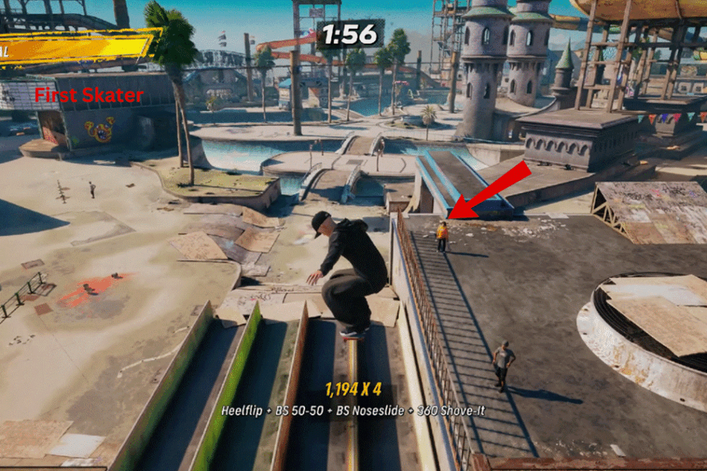There are 7 pro skaters hanging out in the level, and you will need to impress each one with some solid tricks. Here’s a quick route: