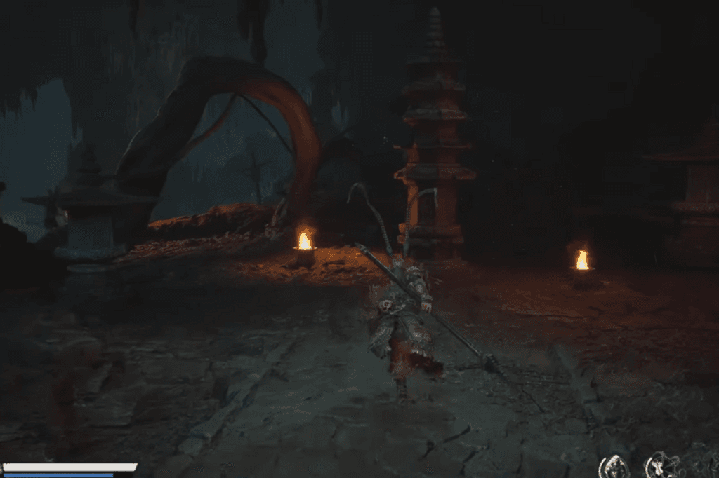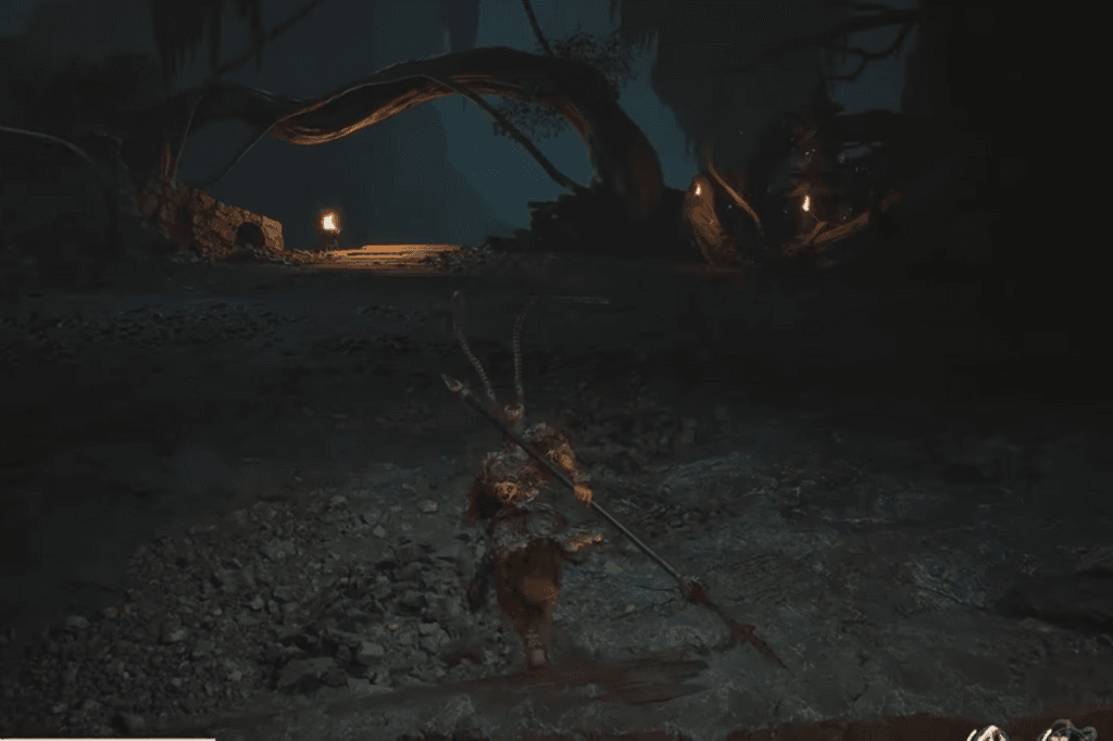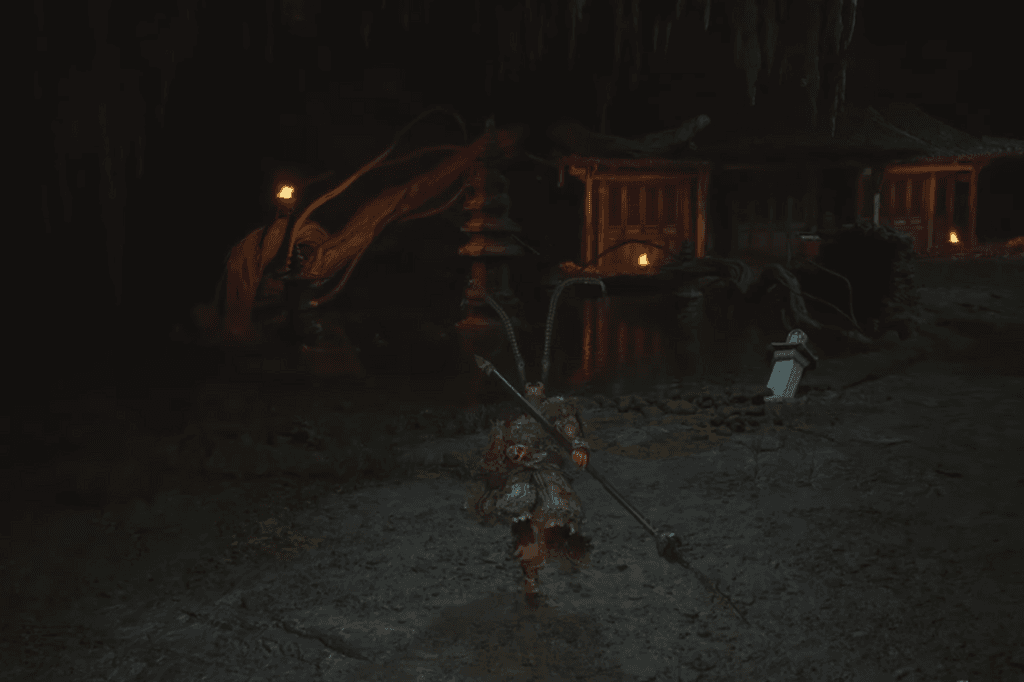 You’ll see some enemies nearby, but don’t worry about fighting them; just keep moving and weave your way through the white cocoons. When you get out of the spider webs, turn left again and keep running. Pass by another enemy until you reach an archway, then go up the stairs in front of you. After that, cross another wooden bridge, and you’ll spot a statue waiting for you. That’s where you can remove the purple talisman.