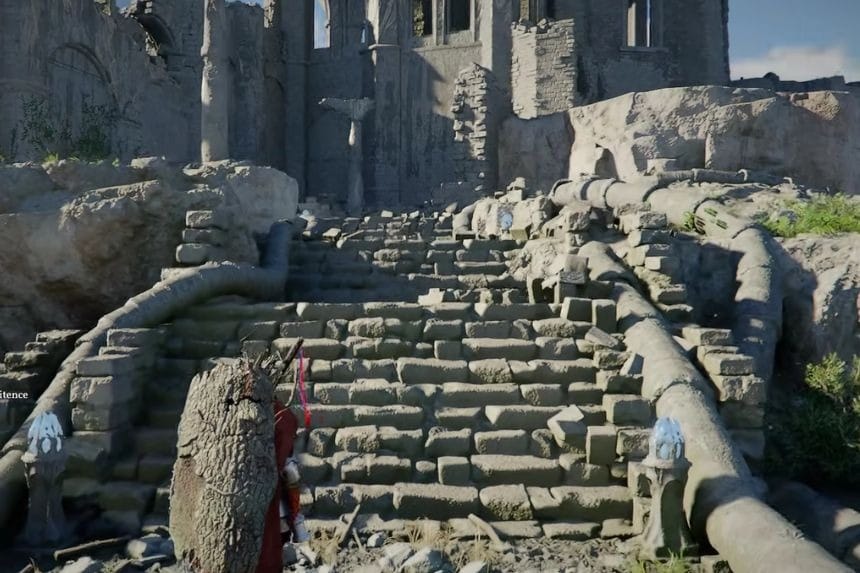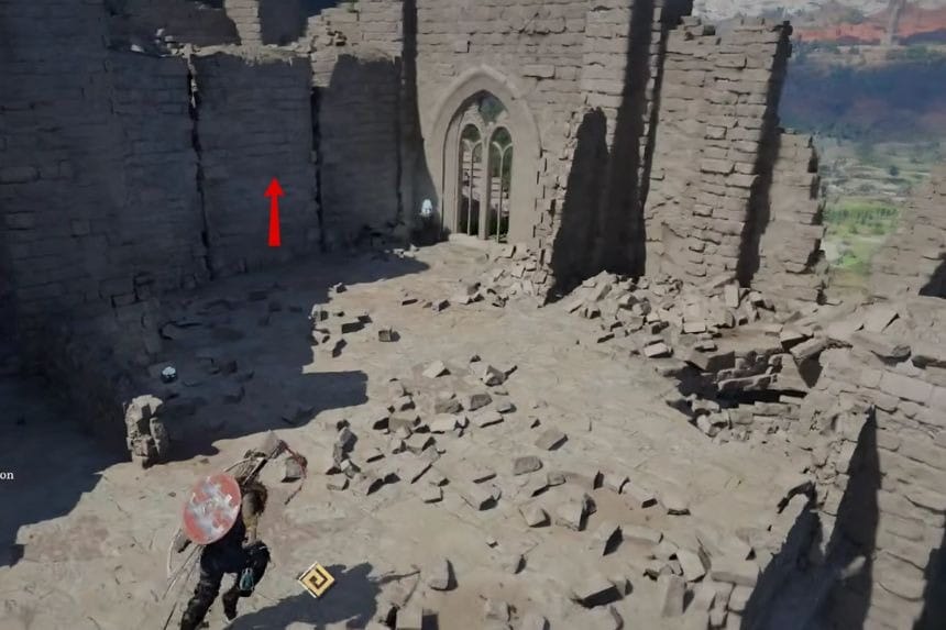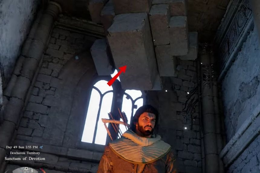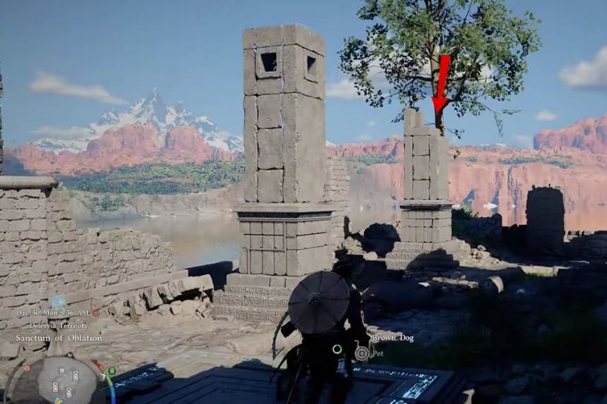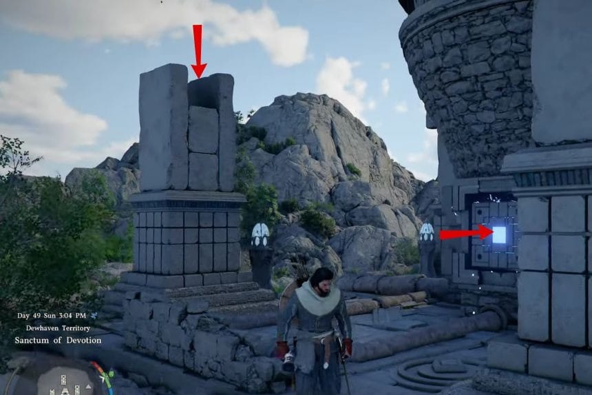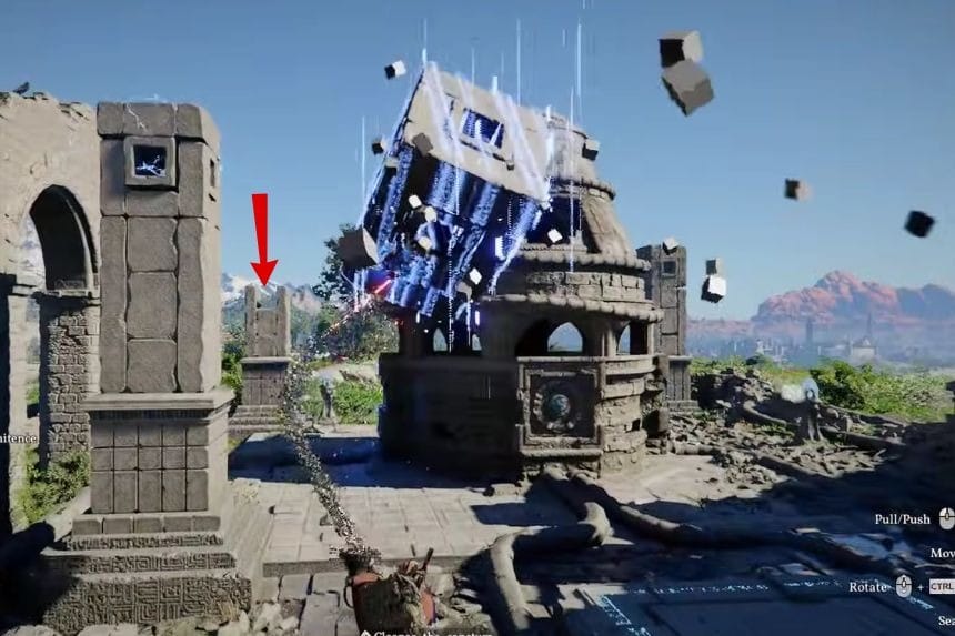 You can find the top part of the column where it is lying on the ground. Take the top part of the column and put it on top of the column. To put the column in the right position, you have to push it slightly so that it can fit in the right position. After the column is fixed, climb on top of the column. From the top of the column, jump and use the Force Palm attack to complete the task. After that, the location is fixed, and you can go forward to meet the witch and cleanse the sanctum.