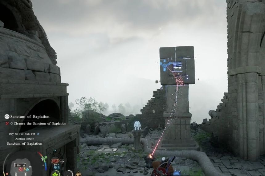 The Sanctum of Expiation is located in Crimson Desert, east of Drakesfall Gorge. To begin solving this puzzle, go down to the lower floor and burn the growths. Then, go inside and look up to find a cube. Use Axiom Force to bring it down. Next, go back to the generator area and look for an empty square slot. Then, use Axiom Force to move it to the empty slot. When it is in the correct position, use Force Palm to put it inside.