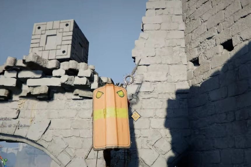 The Sanctum of Revelation is located northeast of Serpent Marsh in Demeniss. To start the puzzle, head west inside the sanctum and go down to the lower floor. You will see a small room with a weak roof stand on top of it, and the roof will break, opening a gap that lets you drop inside. Down there, use Axiom Force on the core to collect Fusion Reactor Core: XXXIV – VI. Bring it back to the main puzzle area and place it on top of the broken pillar.