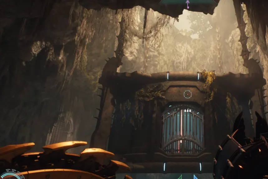 To open the gate, turn back and throw your shield at the chain beside it. Press the following switch, then launch your shield at the barrier’s second lowered section.