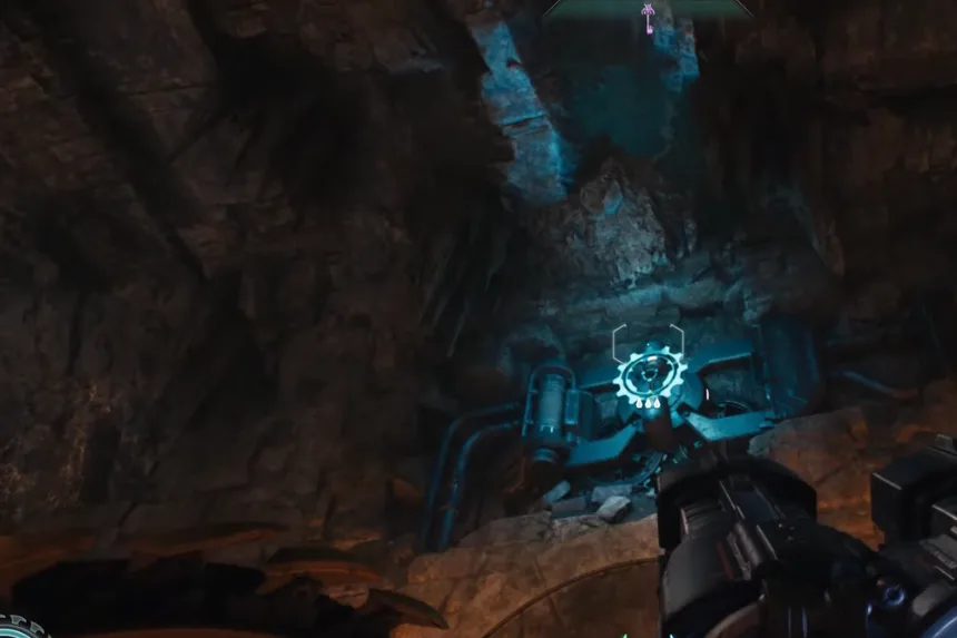 Continue into another chamber by following the red line on the floor. To reach a switch that turns on a jump pad, turn right and proceed through. Leap up with it, then turn the corner to press another switch. The barrier’s last section will be destroyed as a result.
