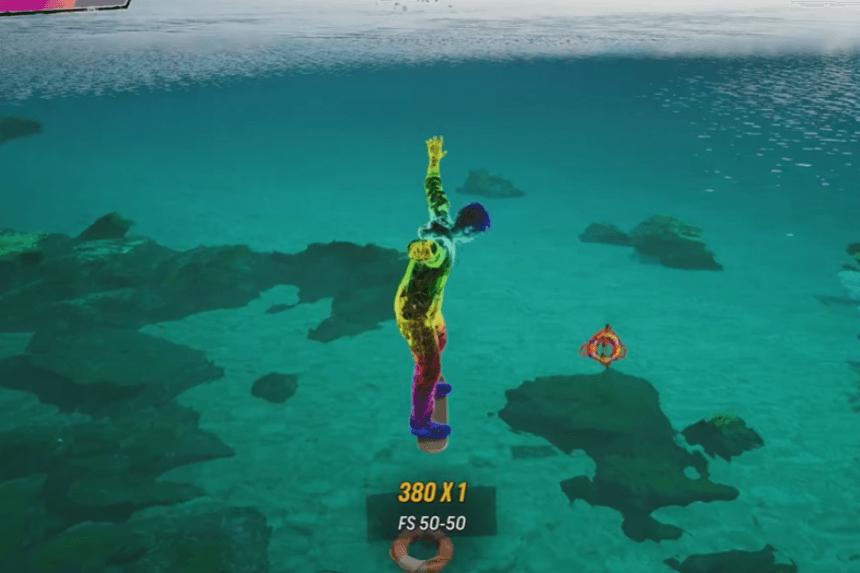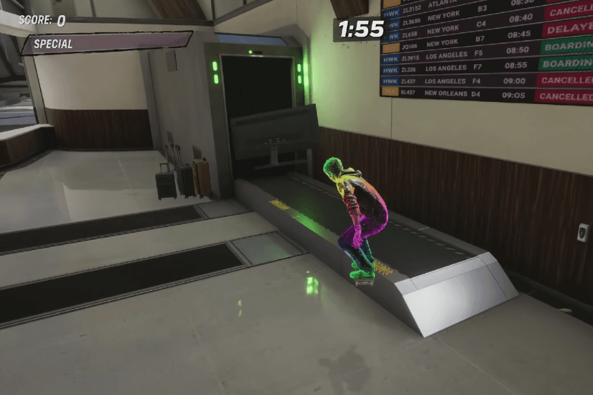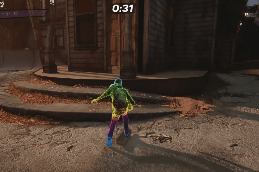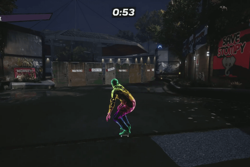 The Haunted House unlocks after you complete the “Help the Thin Man” goal. But there’s also a fun shortcut if you jump through the front door, you’ll trigger a spooky cutscene where your skater falls into the void. It’s the first time something like this happens in the series!