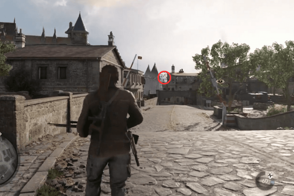 When you get to the enemy fortress at the top of the map, hold on – don’t cross the bridge and go inside just yet. Instead, look to your right. You should see a big hole in the castle wall. Now, look even further to the right, and you’ll spot the Stone Eagle perched on the corner.