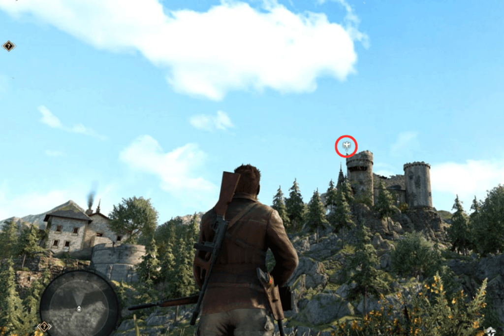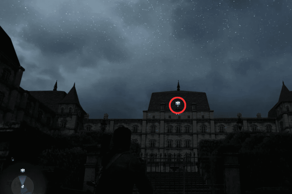 Right at the beginning of the mission, take the zipline across and then head up the hill. Before you start climbing the cliff, look to your right and up towards the castle. You’ll find the Stone Eagle on the left-hand turret.