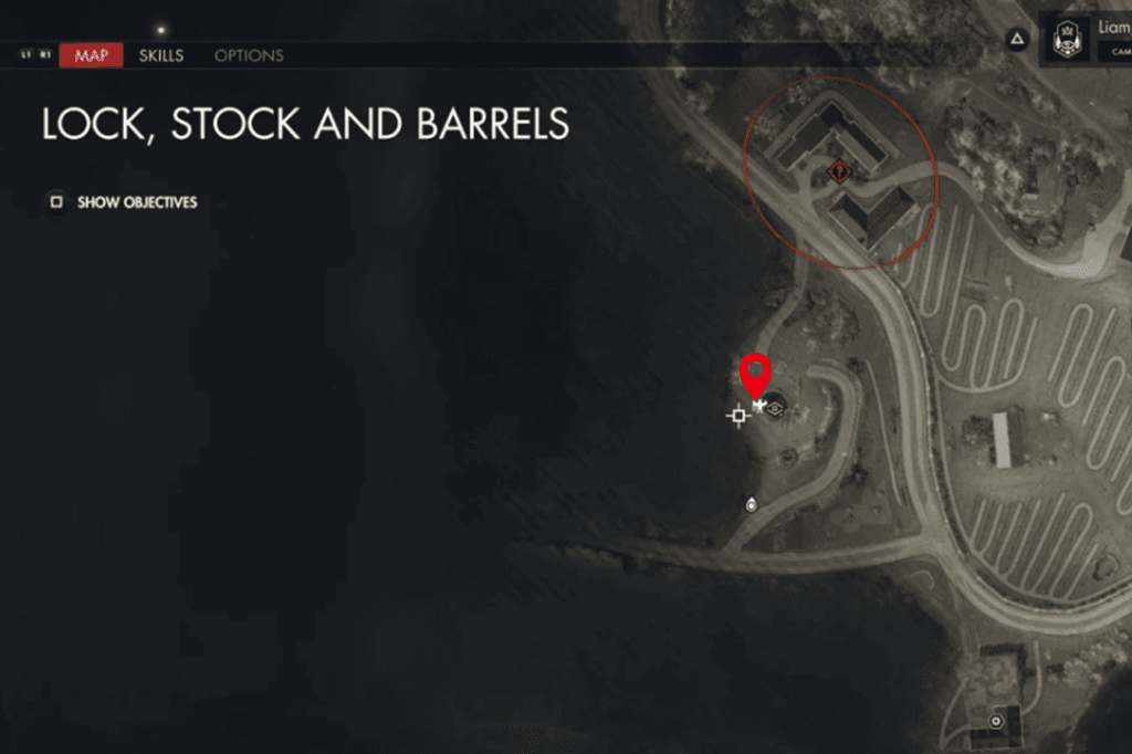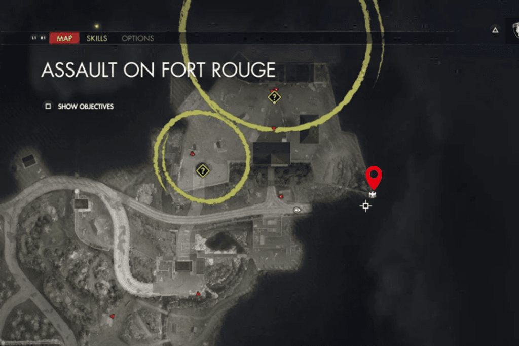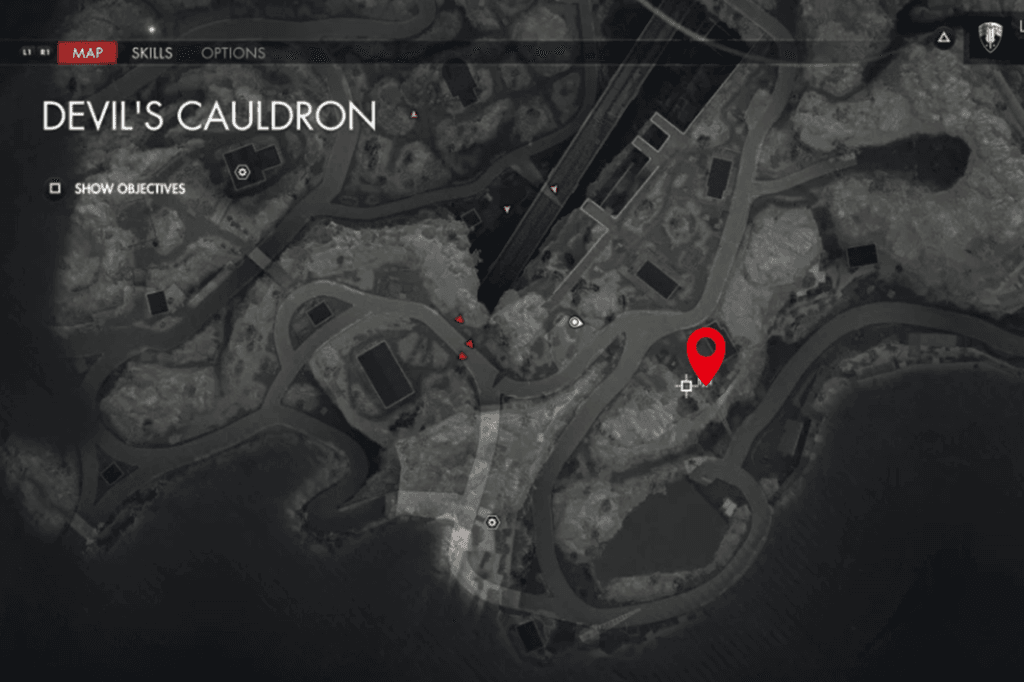 This Stone Eagle is located on the east corner of the biggest building right in the center of the map. It’s the same building that’s circled on your map as the place where you need to find a way to trap the Zugwerfer.