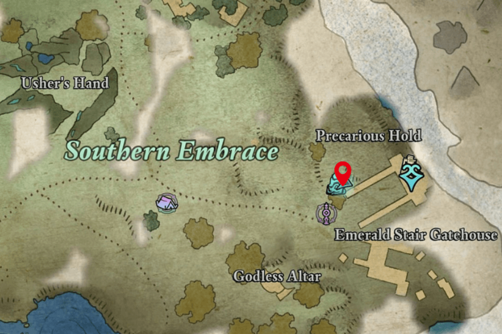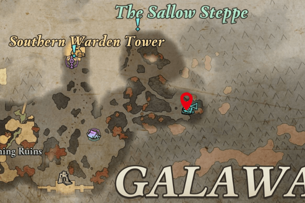 The fourth Strangled Adra is easy to find, but it’s in a Xaurip camp in the southern part of the Sallow Steppe, so you’ll probably have to fight some enemies first. The camp is pretty close to where you start the Galawain’s Tusks quest. Once you’re in the camp, you can’t miss the Adra – it’s sitting on top of a rocky ledge. Just climb up the rock platforms to reach it and interact with it to get an Adra Ban.