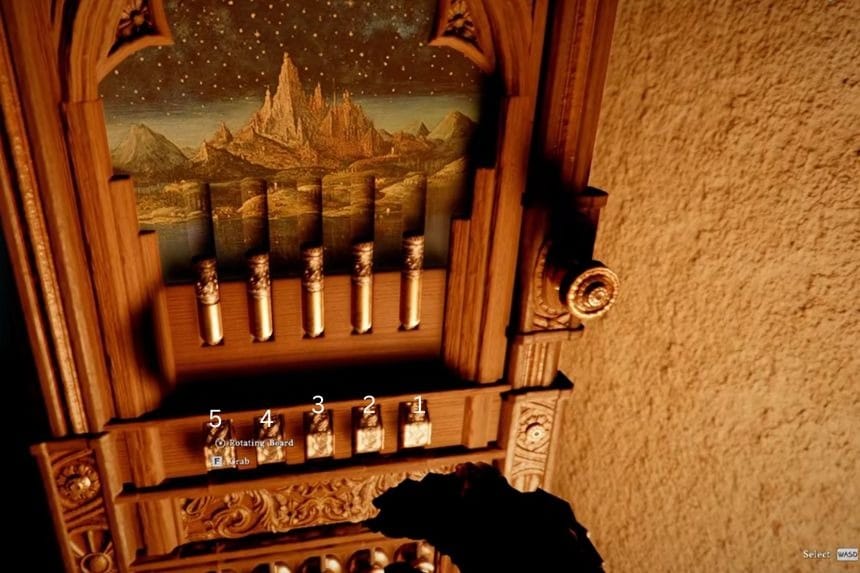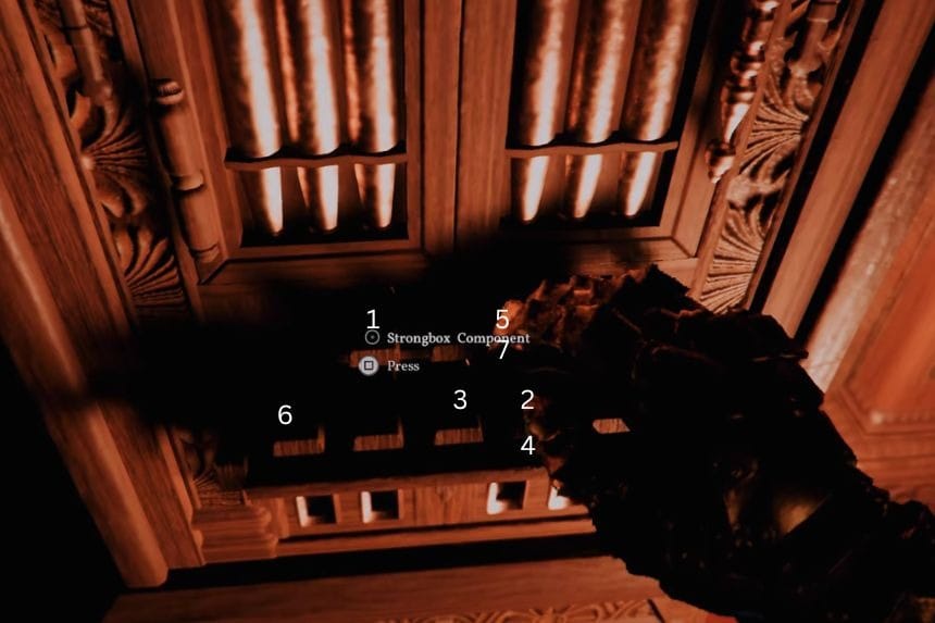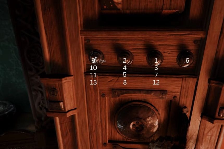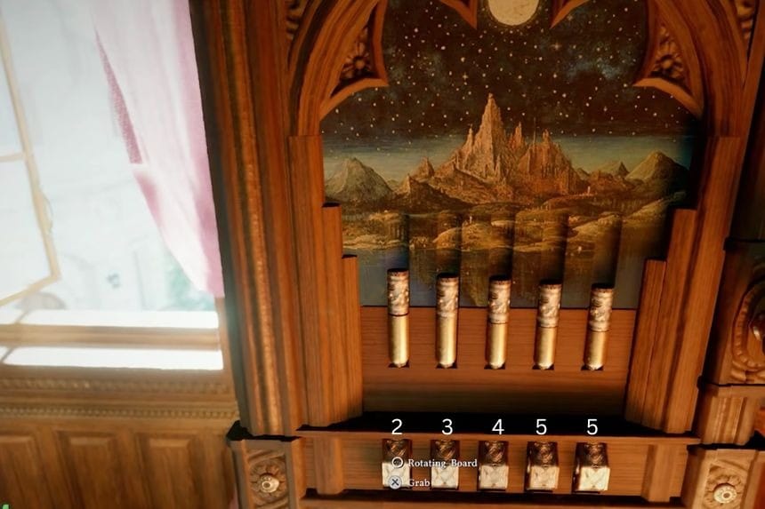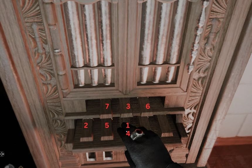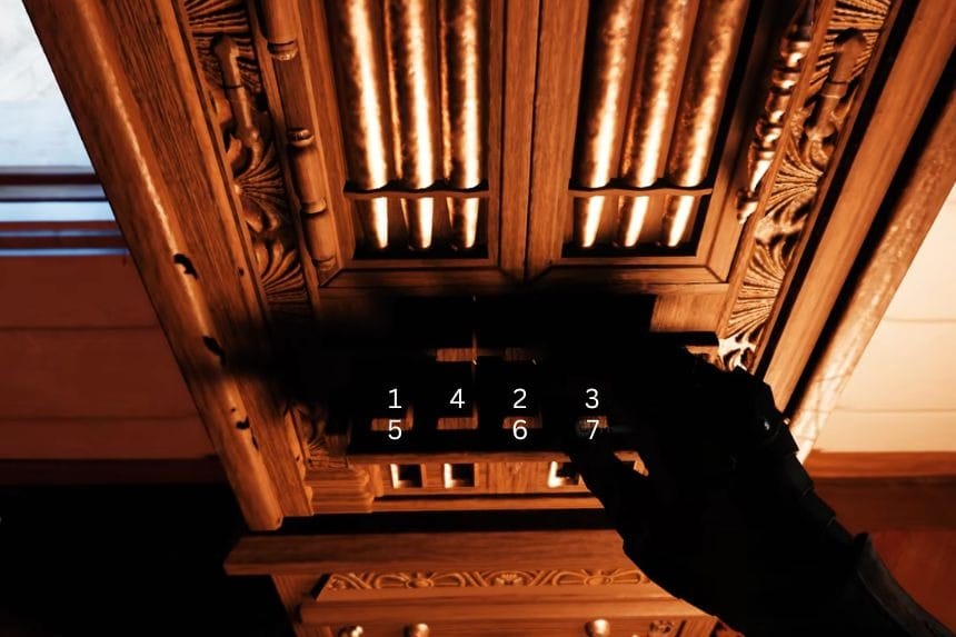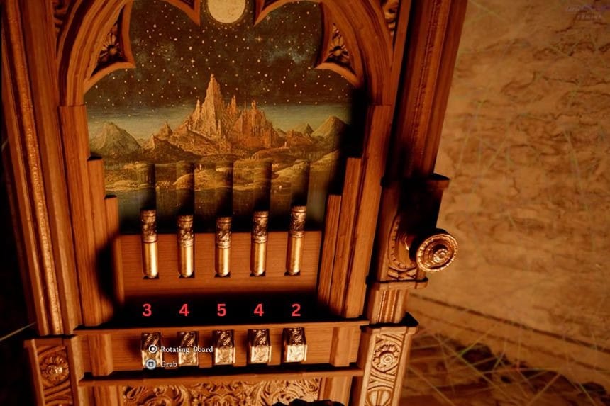 Once you enter the manor, head inside and go up the stairs. Move around the upper area, and you’ll find another puzzle. Each pin is a different size, and each one needs to be rotated a specific amount. You can rotate them little by little.