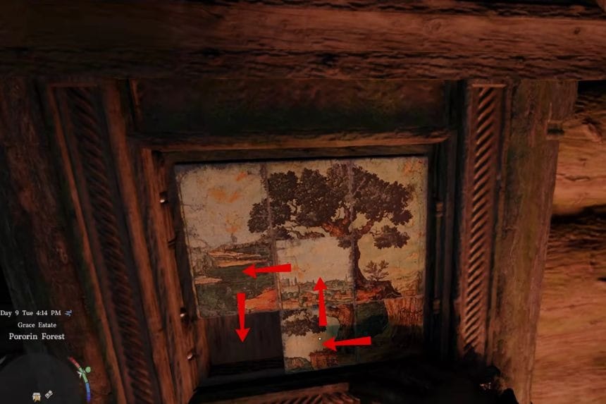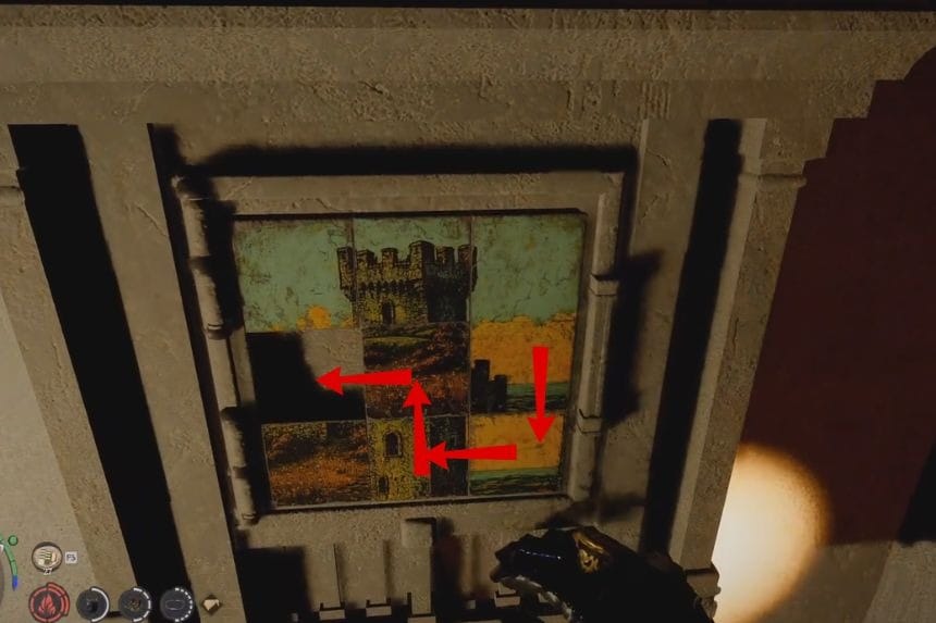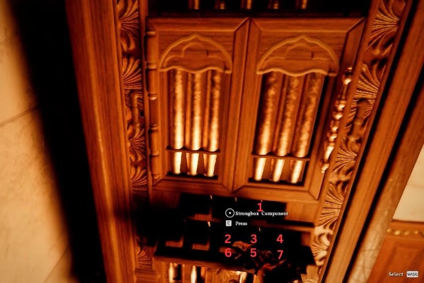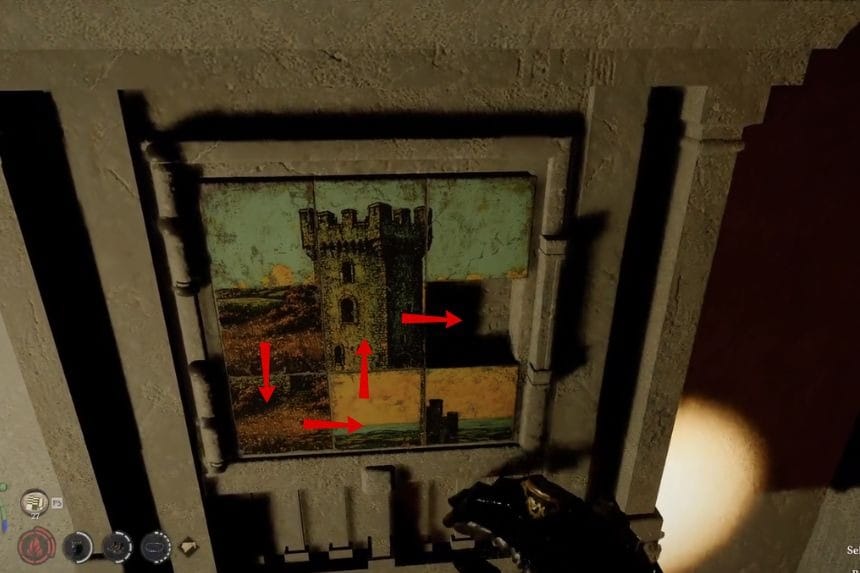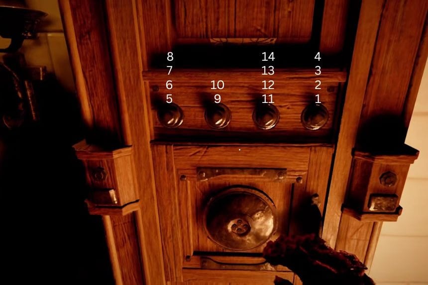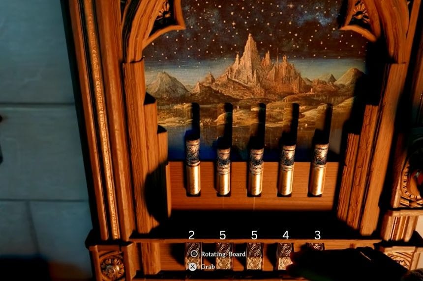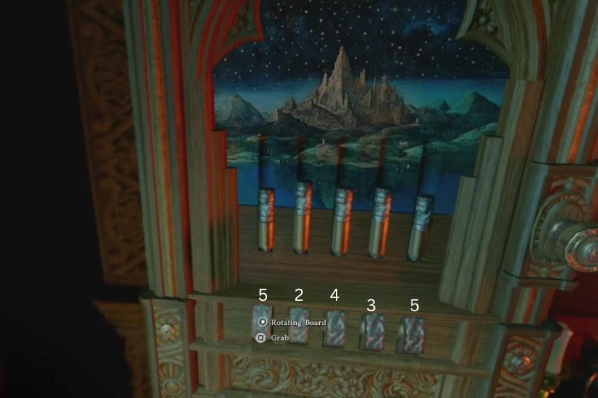 Once you enter the manor, head inside and go up the stairs. Move around the upper area, and you’ll find another puzzle. Each pin is a different size, and each one needs to be rotated a specific amount. You can rotate them little by little.