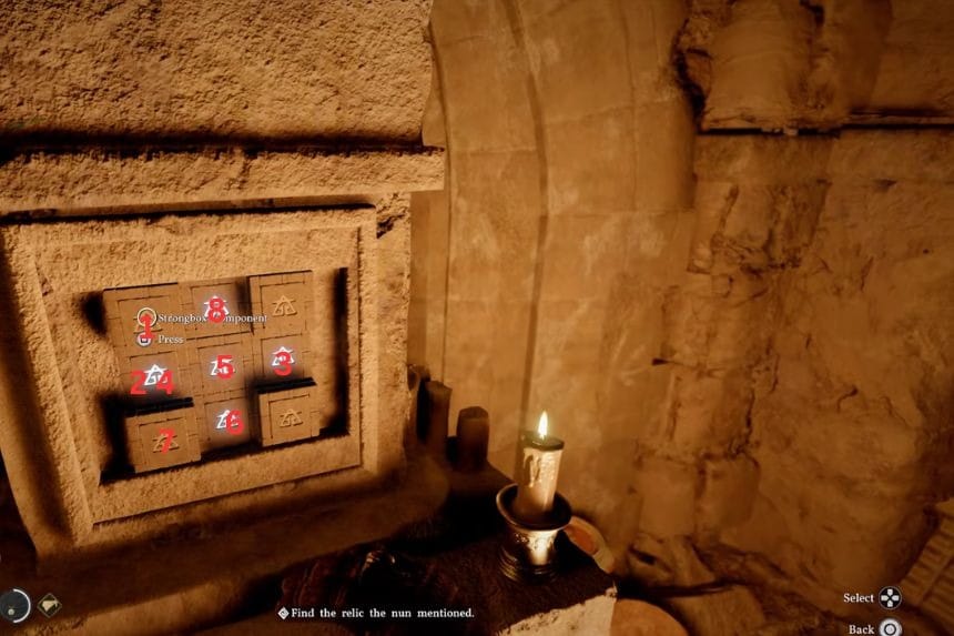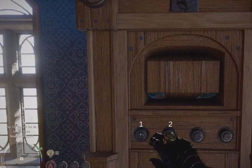 To open the Southern Court strongbox, start by pressing the first button from the left once, then press the second button from the left twice. Once the image lines up correctly, the box will unlock. Open it up to collect your reward, the Witch’s Earring. It gives you 3 Defence and slowly restores health over time, adding +0.2 HP every second.