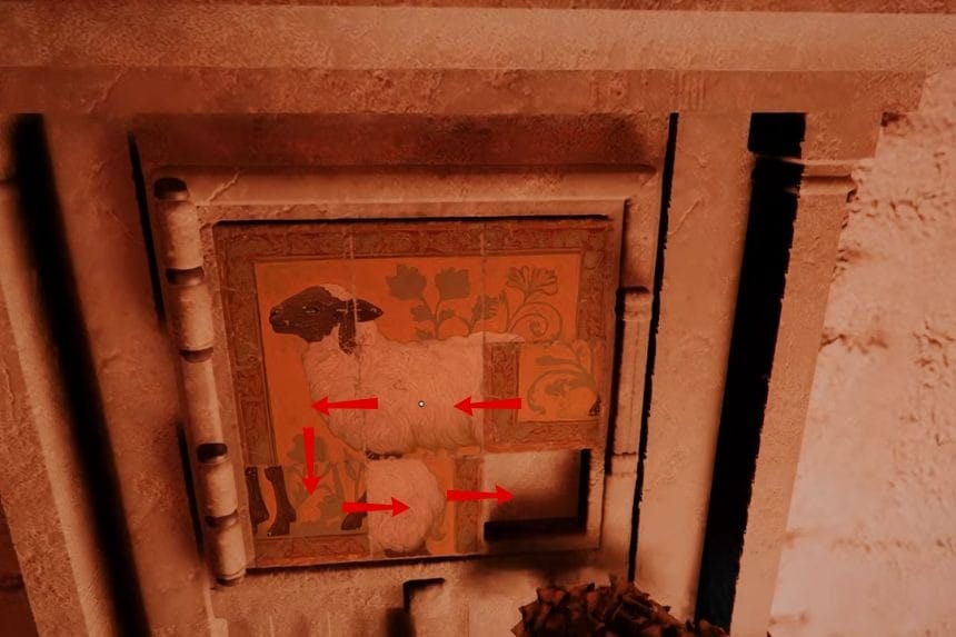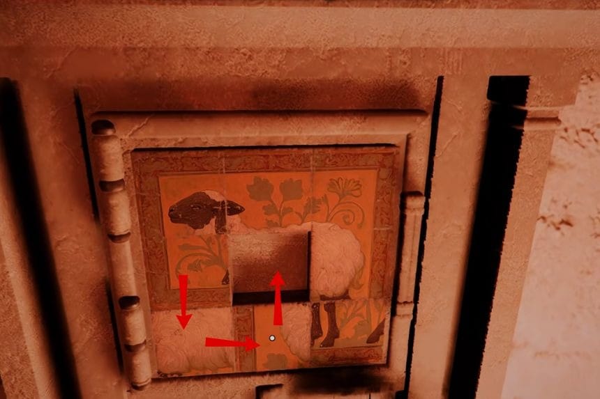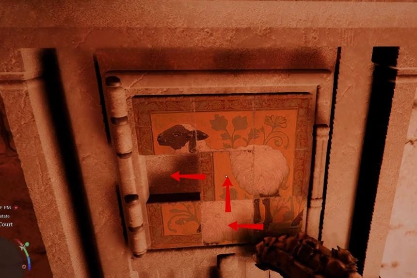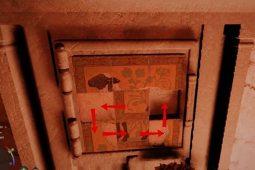 To solve the Western Court strongbox puzzle, you need to slide the panels around until they form the picture of a sheep. Start by moving the bottom middle tile to the right. Then move the bottom left tile to the right as well. After that, slide the centre left tile downward, and move the centre tile to the left. Next, shift the centre right tile to the left.