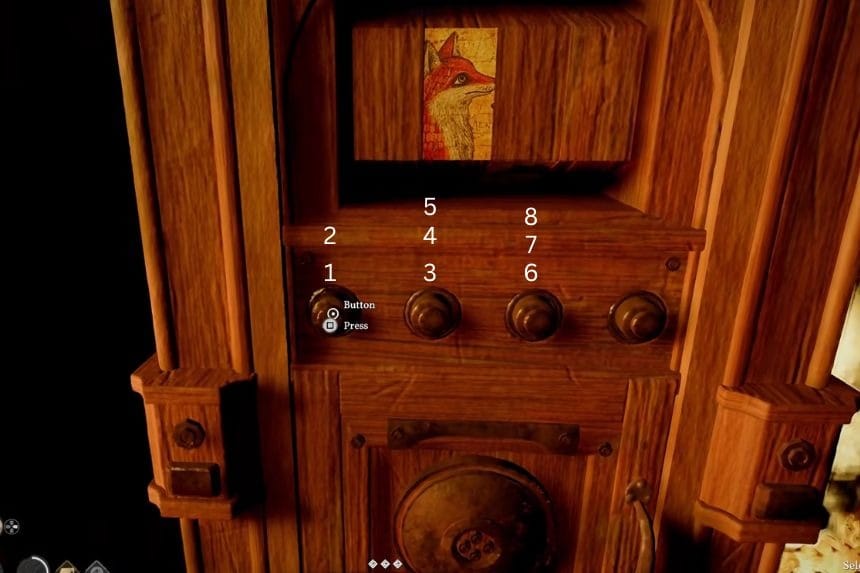 The puzzle has four buttons, but you only need to use the first three. Start by pressing the first button twice, then press the second button three times, and finally press the third button three times. Once you’ve done that, the strongbox will unlock. Once you’ve lined everything up and the image of the two foxes is complete, the strongbox will unlock. Go ahead and open it to collect your reward, the Ancient Earring.