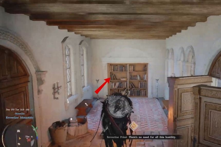 You’ll find this strongbox inside Reventine Monastery, which is located on the west side of Demeniss. Once you’re inside the monastery, head to the southeast corner and look for a bookshelf against the wall. Go up to it and interact with it will move and reveal a hidden room. Walk through into that secret room, and you’ll find the strongbox along the wall on your left.